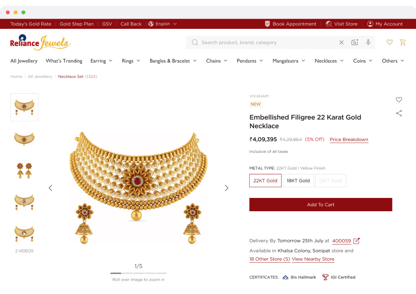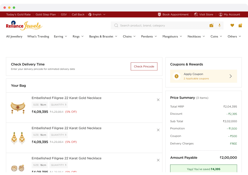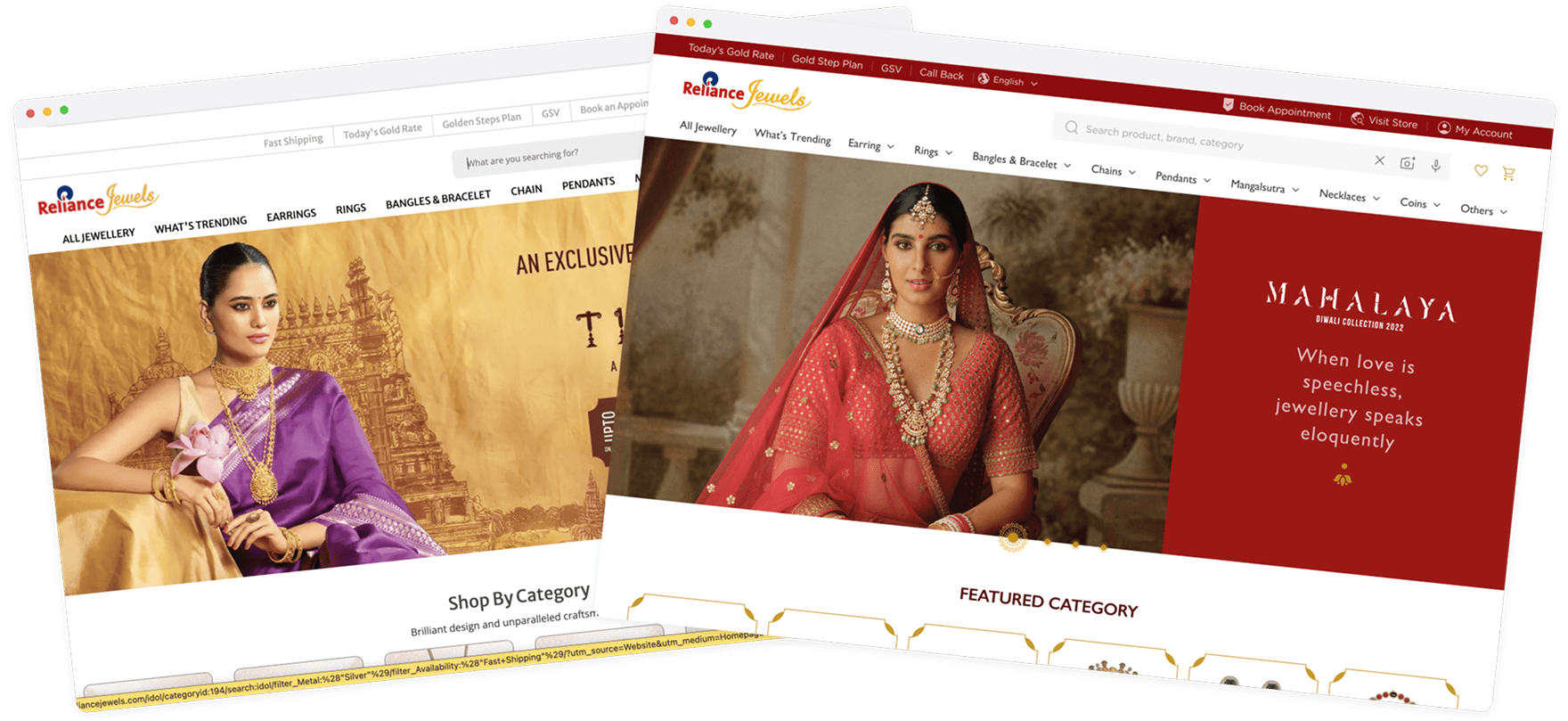 Reliance Jewels, a leading Indian jewelry brand, wanted to enhance its digital presence. The previous website suffered from poor usability, unclear structure, and a dated interface. The redesign aimed to modernize the website visually and functionally while improving discoverability, trust, and conversions—especially across mobile devices.